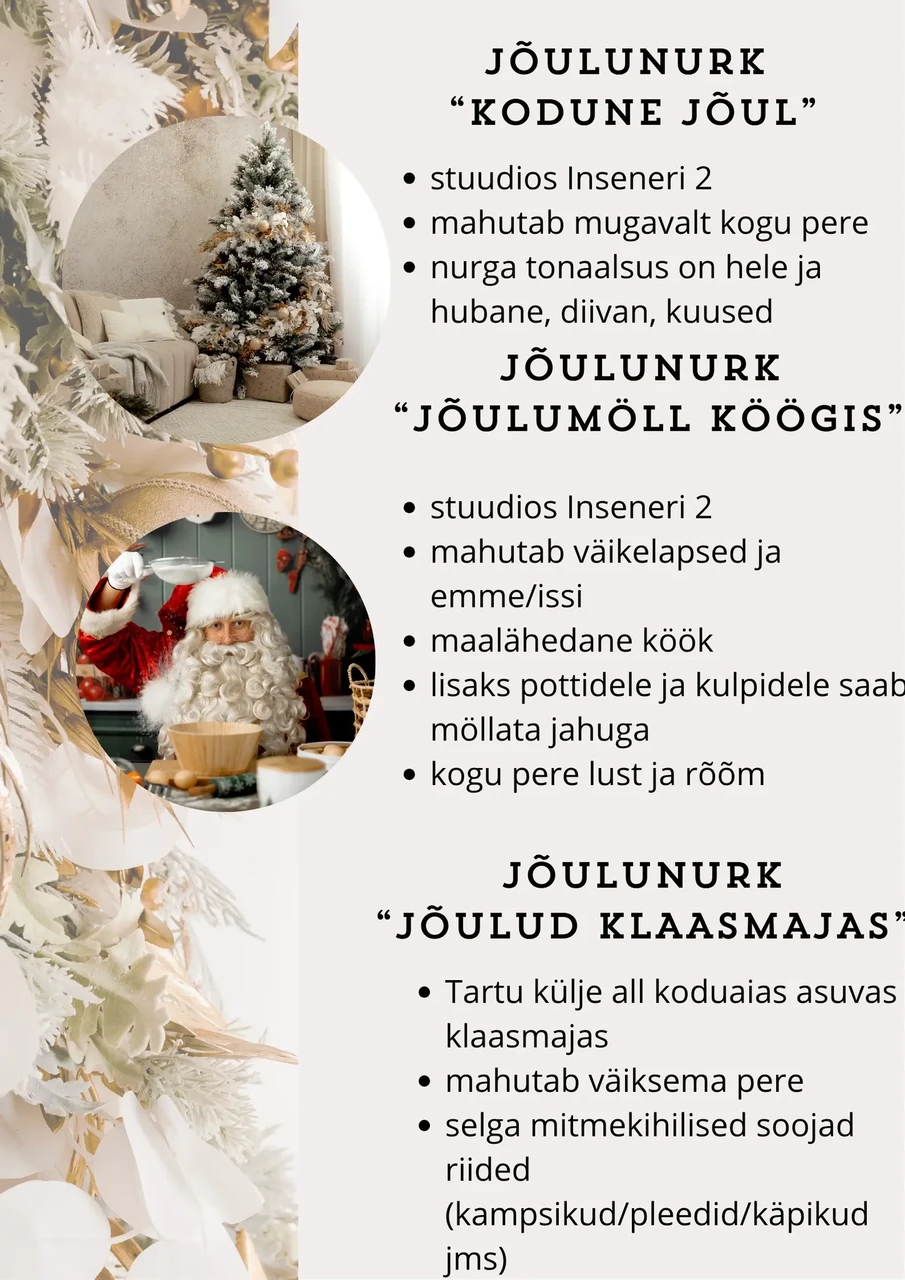 Lääts Loob Pildi Jõulustuudios 2025 leiad 2 erinevat fotonurka. Pisem kööginurk, kus saab igaüks end lapsenda tunda ja jahuga möllata. Hele ja helge fotonurk, milles loome klassikaliselt meeldejäävalt